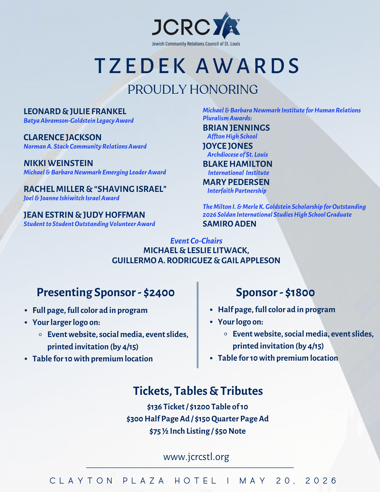 The word Tzedek means "justice" in Hebrew. Our Tzedek Award honorees embody the mission of JCRC, to foster a just, democratic, and pluralistic society in St. Louis, across the US, and in Israel - building bridges of understanding that seek to combat antisemitism and challenge all forms of hate, bias, and bigotry.